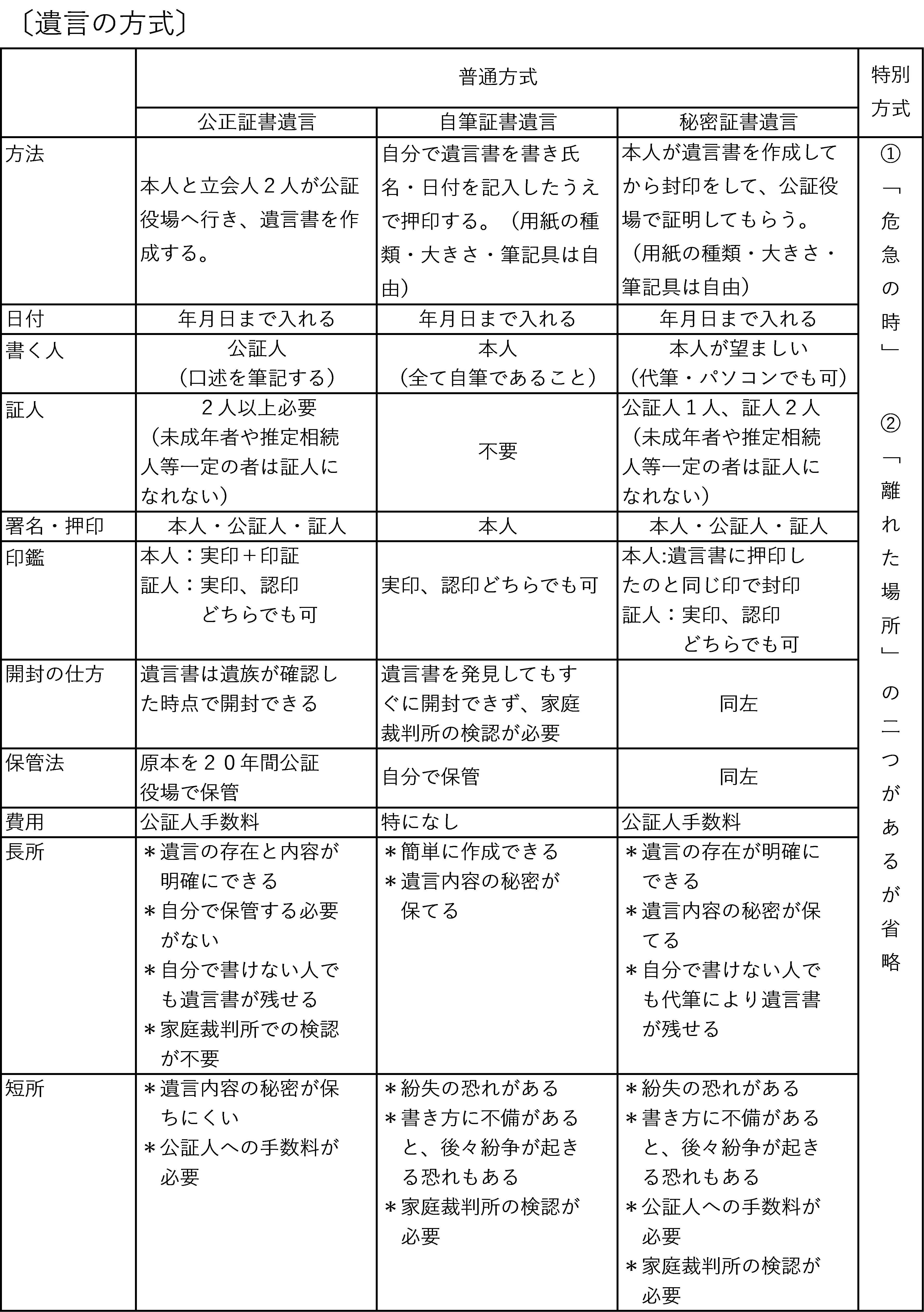 遺言の形式は、〔普通方式の遺言書〕と〔特別方式の遺言書〕の2種類があります。この普通方式の遺言書には3つの書き方があります。自筆証書遺言、公正証書遺言、秘密証書遺言の3つです。