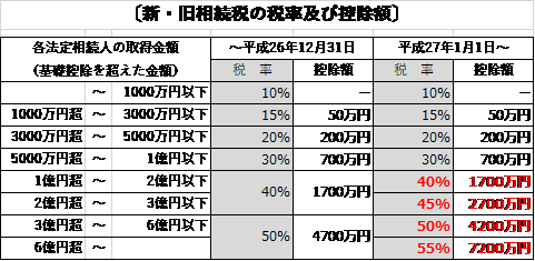相続税の税率が引き上げられています。下記の〔新・旧相続税の税率及び控除額〕にある通り、2億円超部分が45%に、6億円超部分が55%になりました。